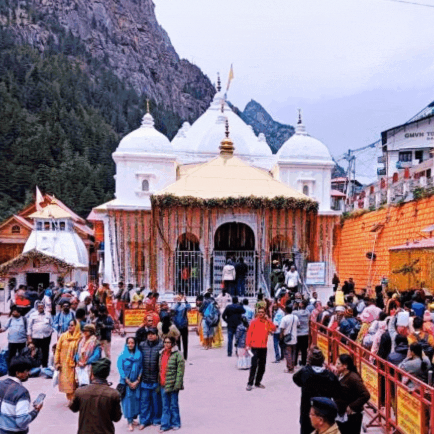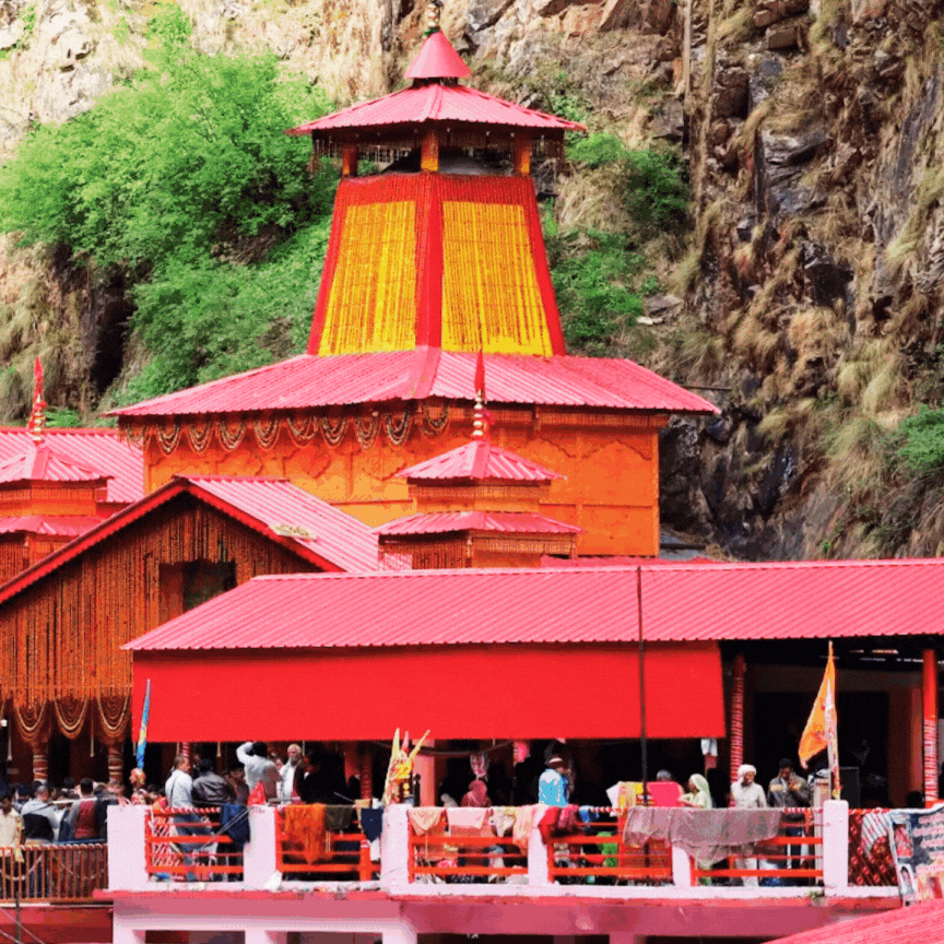 To see this sacred home of Mother Yamunotri, which glows with bright colors—red, yellow, and orange—against the great mountains of the Bandarpoonch range, you must first climb a steep, beautiful six-kilometer path starting from Janki Chatti. This temple was built a long time ago in 1835 by Raja Sudarshan Shah of Tehri. Inside its heart (the inner sanctum), there is a striking, beautiful idol of Goddess Yamuna, carved from shining black marble. The temple’s daily life, its worship, and the care of its offerings are entrusted to the Uniyal Brahmins, the local priest family who serve here.